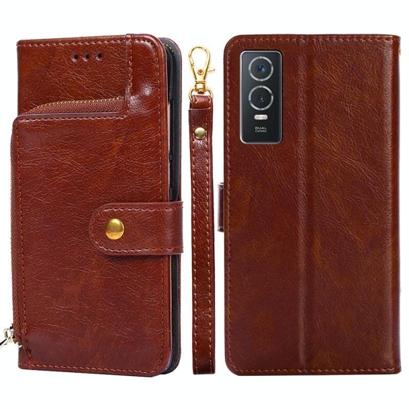 Για vivo Y76s Κίνα / Y74s φερμουάρ τσάντα δερμάτινη θήκη τηλεφώνου (Καφέ)