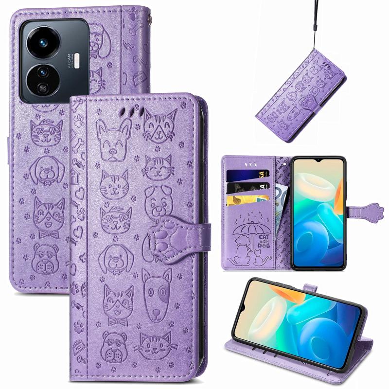 For vivo Y77 5G Global Cat and Dog Embossed Leather Phone Case(Purple)