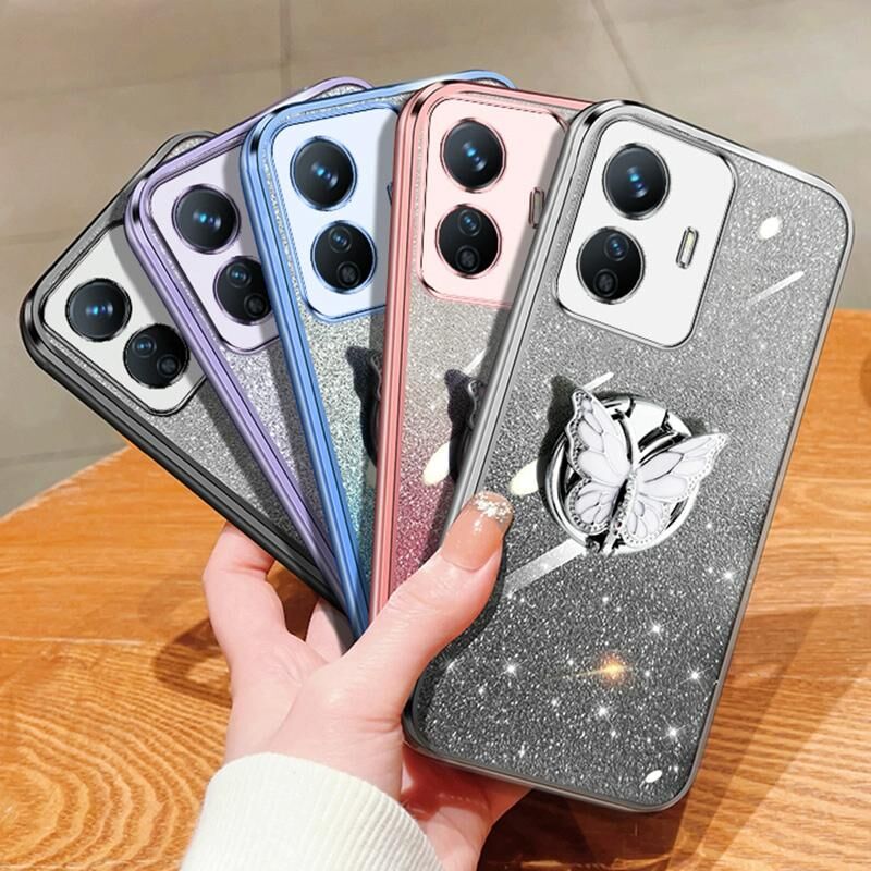Για το vivo Y77E Επιμεταλλωμένο διαβάθμιση Glitter πεταλούδα κάτοχος TPU τηλέφωνο υπόθεση (μαύρο)