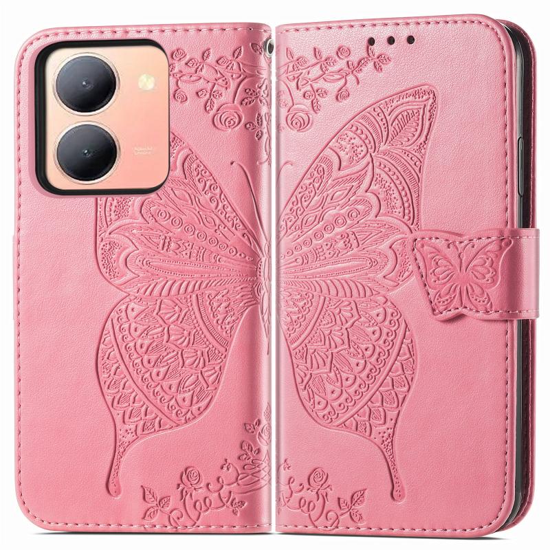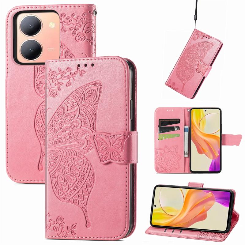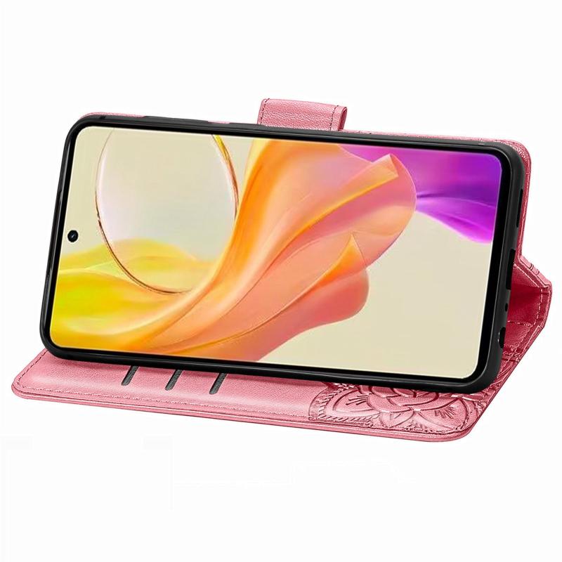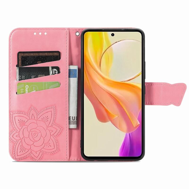 Θήκη τηλεφώνου από δέρμα με ανάγλυφο σχέδιο πεταλούδας και λουλουδιών για vivo Y78 (ρόζ)