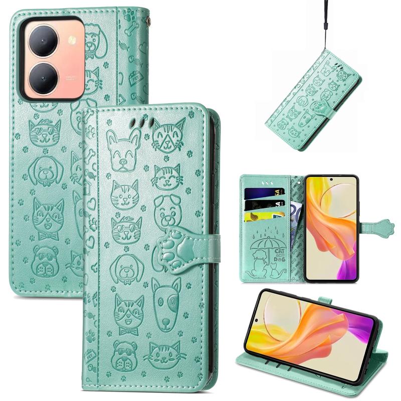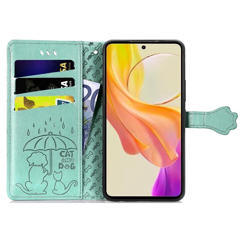For vivo Y78 Cat and Dog Embossed Leather Phone Case(Green)
