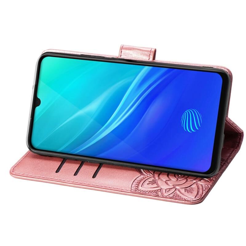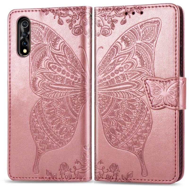 Θήκη δέρματος οριζόντιας αναδίπλωσης για Vivo Y7s / S1 με ανάγλυφα σχέδια πεταλούδας και λουλουδιών, με βάση στήριξης, θήκες καρτών, πορτοφόλι και κορδόνι (Χρυσό ροζ)