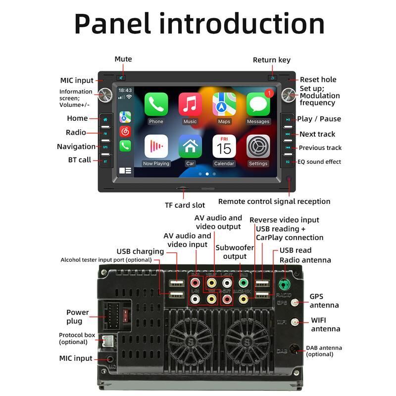 12. Support reversing image, video warning, steering wheel control (button learning), video output, offline map, driving recorder (USB signal input), GPS navigation, rear USB (USB2.0 X 2) 5V USB port (rear USB charging port, 2.1A), TEST USB port (alcohol tester input port), external microphone port, TF card, reset button