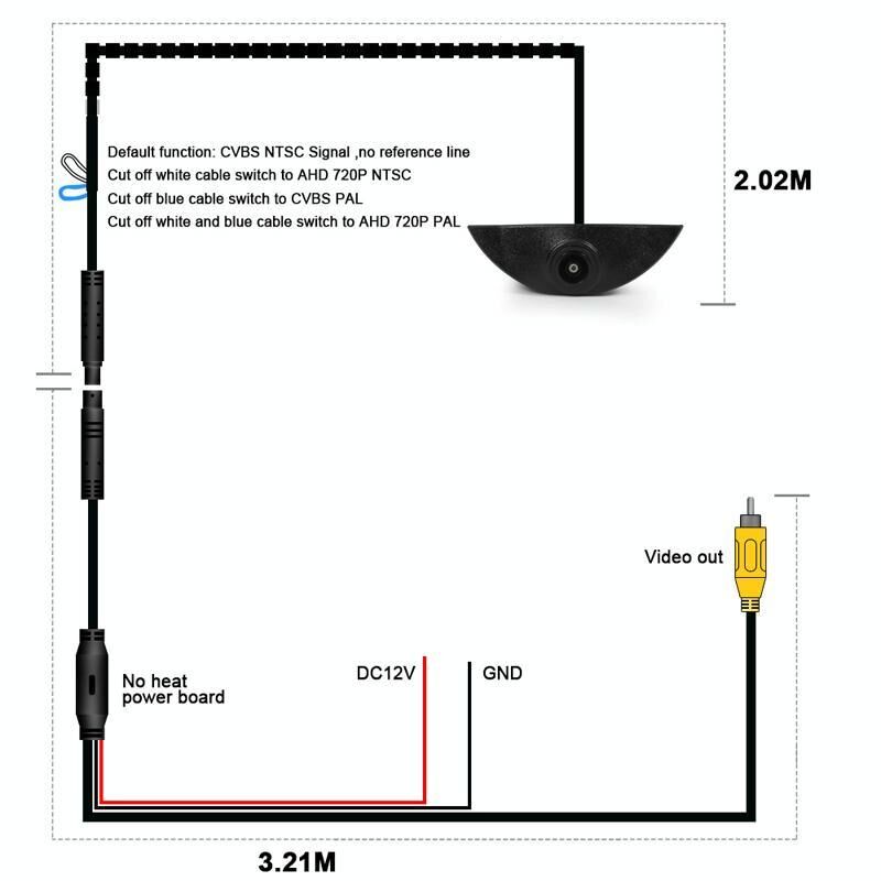 2. Default camera setting CVBS signal output, NTSC, switchable AHD 720P signal, PAL