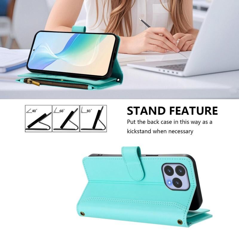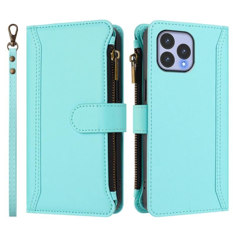 For Wiko T60 / Cubot P80 Magnetic Closure 9 Card Slots Zipper Leather Case with Hand Strap(Mint Green)