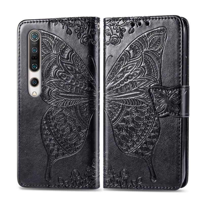 Θήκη δέρματος οριζόντιας αναδίπλωσης για Xiaomi 10 με ανάγλυφο σχέδιο πεταλούδας και λουλουδιών, με βάση στήριξης / υποδοχή κάρτας / πορτοφόλι / κορδόνι (Μαύρο)