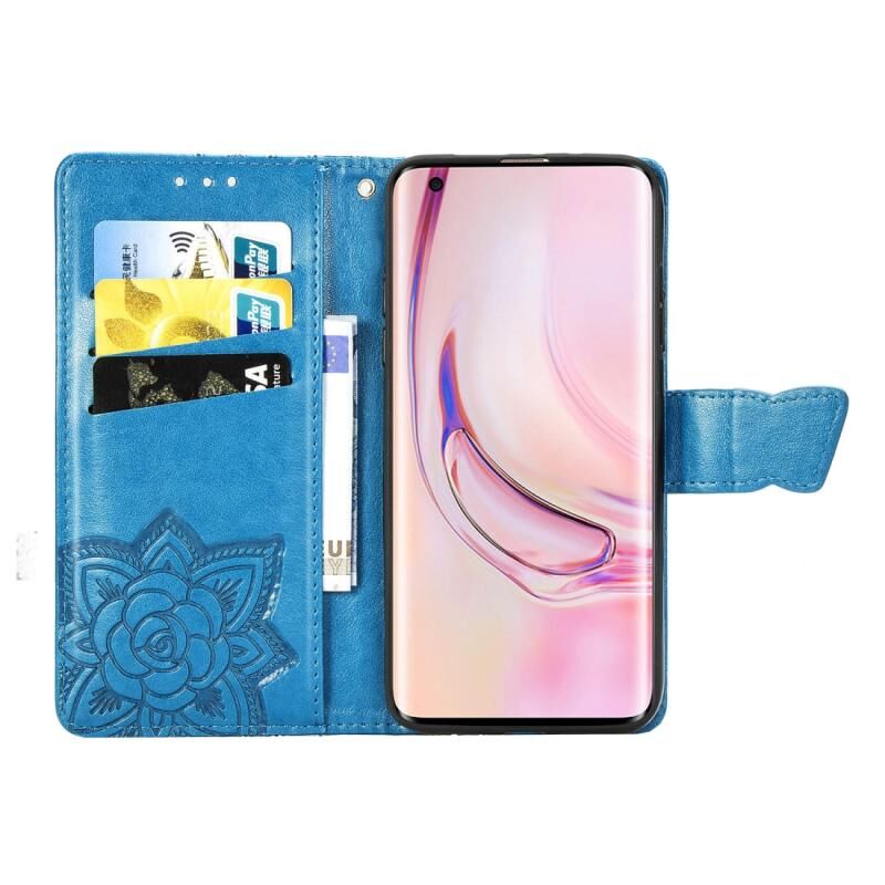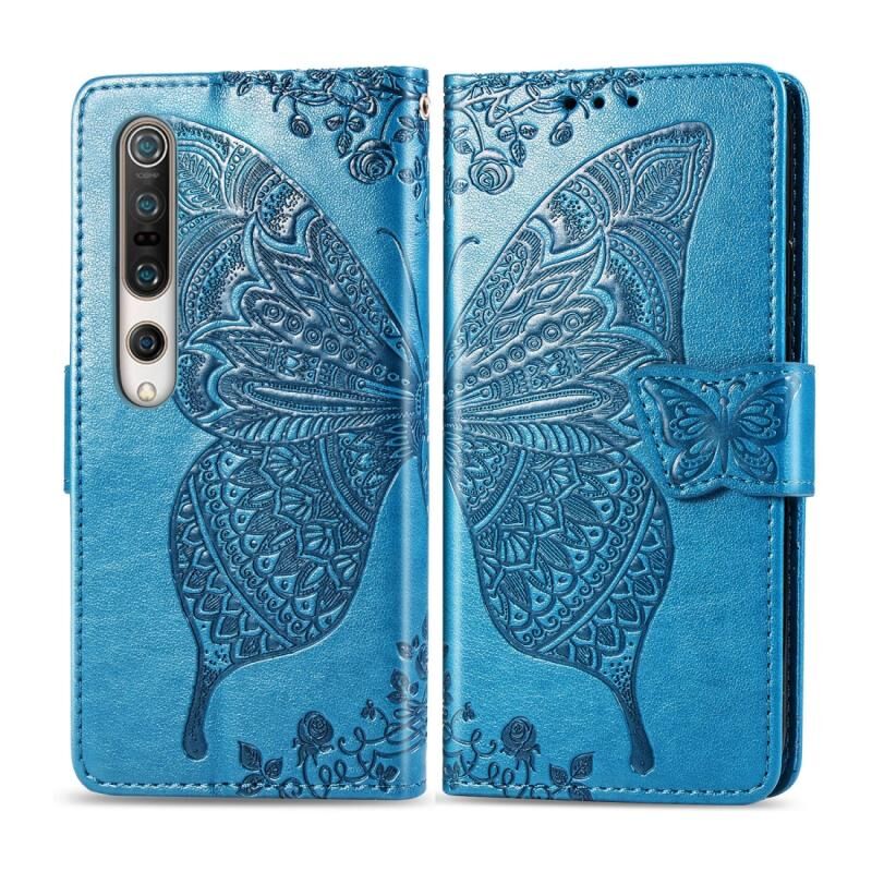 Θήκη δέρματος οριζόντιας αναδίπλωσης για Xiaomi 10 με ανάγλυφο σχέδιο πεταλούδας και λουλουδιών, με βάση στήριξης / υποδοχή κάρτας / πορτοφόλι / κορδόνι (Μπλε)