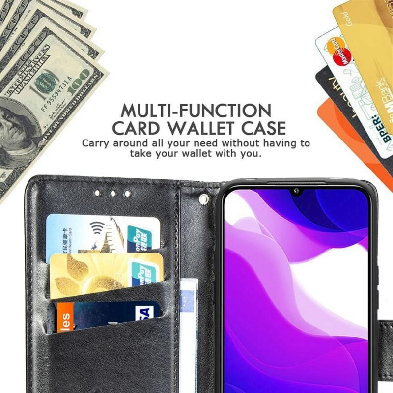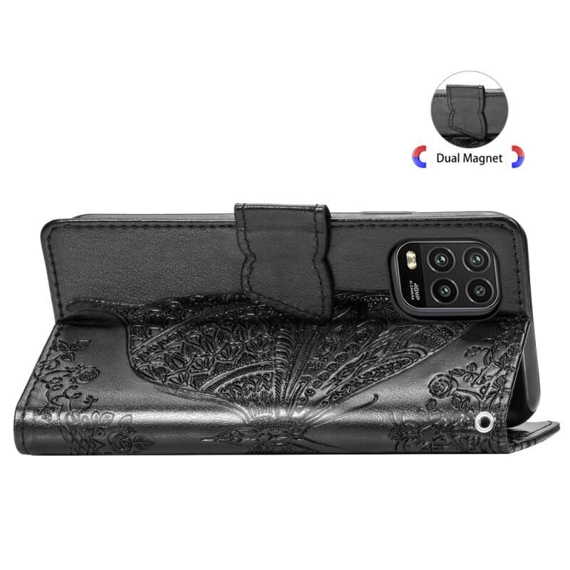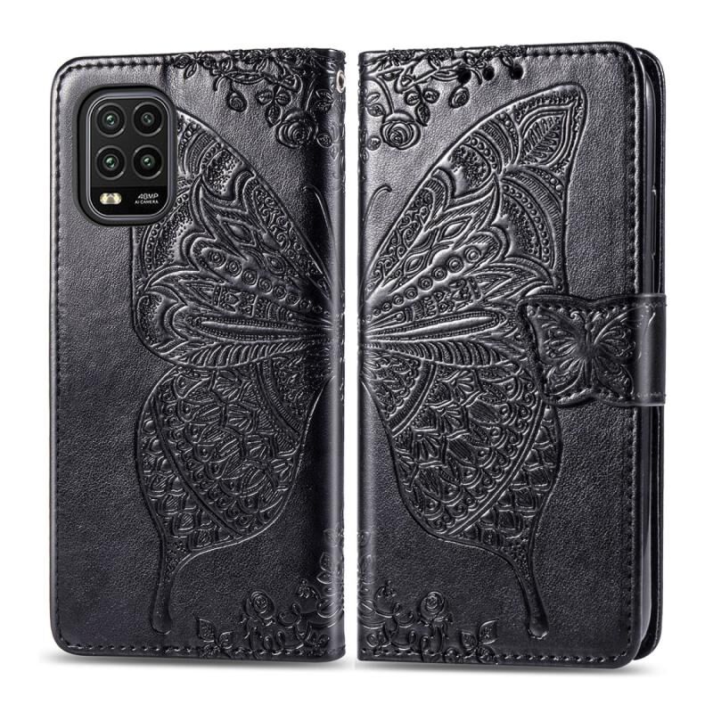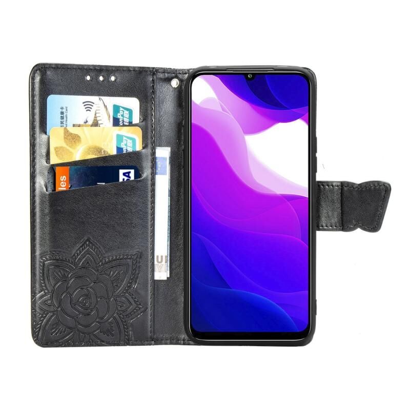 Θήκη δέρματος οριζόντιας αναδίπλωσης για Xiaomi 10 Lite 5G με ανάγλυφο σχέδιο πεταλούδας και λουλουδιών, με βάση / υποδοχή κάρτας / πορτοφόλι / κορδόνι (Μαύρο)