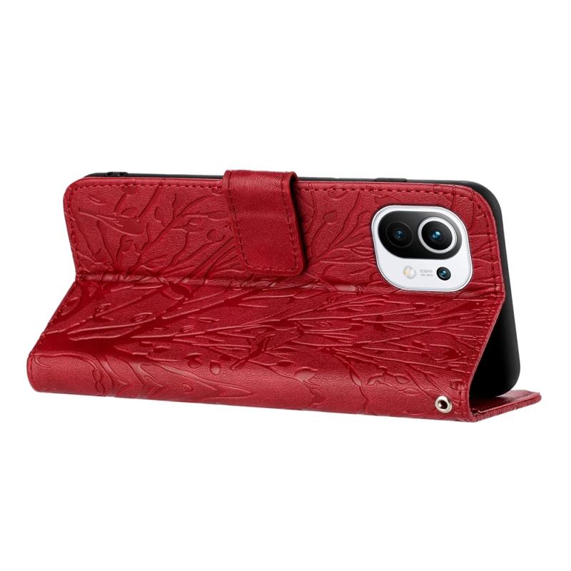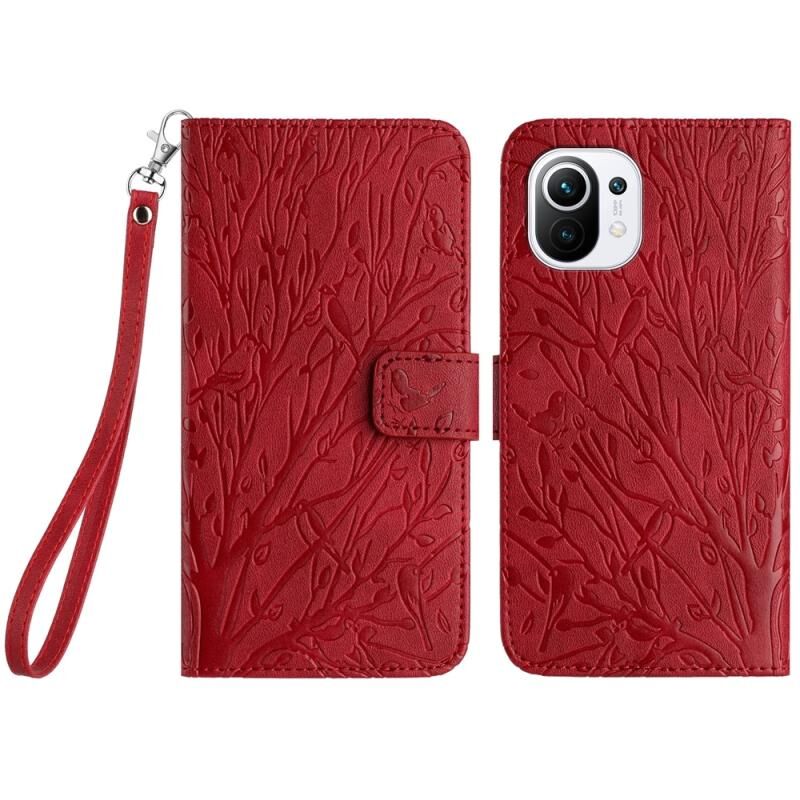 Θήκη δερμάτινη με ανάγλυφο σχέδιο πουλιών και δέντρων για Xiaomi 11 Lite (Κόκκινο)