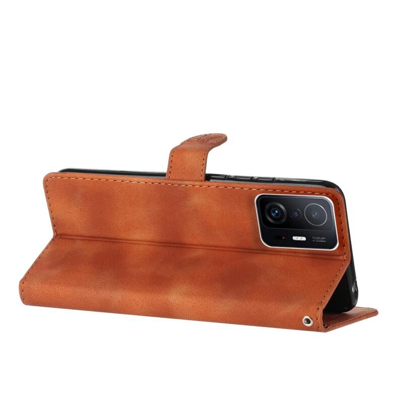 Για Xiaomi 11T / 11T Pro λουλούδι πεταλούδα ανάγλυφο μοτίβο δερμάτινη θήκη τηλεφώνου (καφέ)