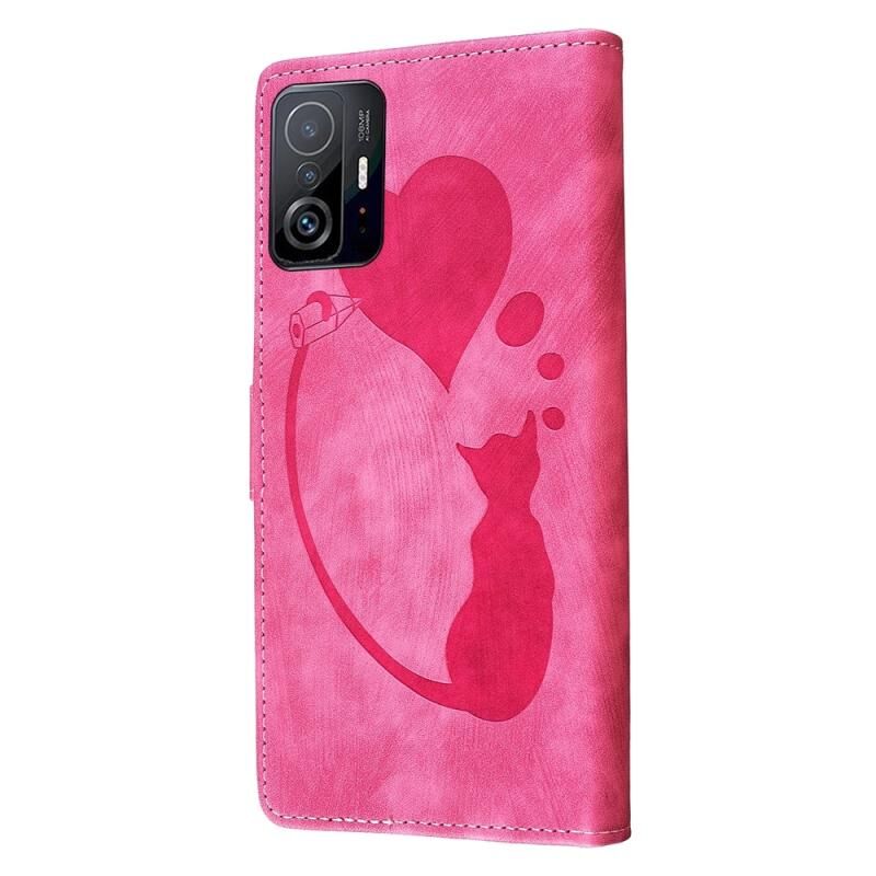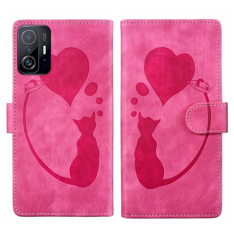 Θήκη τηλεφώνου από δέρμα με ανάγλυφο σχέδιο καρδιάς και γάτας για Xiaomi 11T / 11T Pro (Πορτοκαλί)