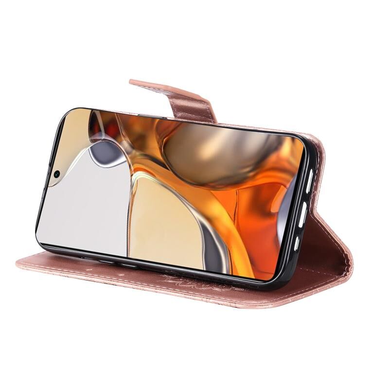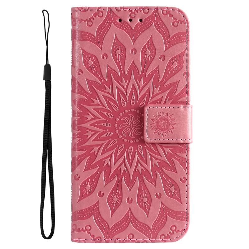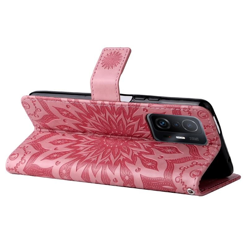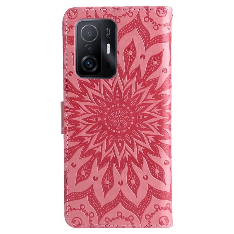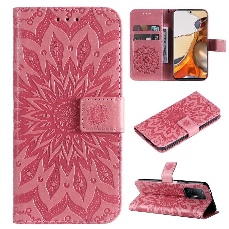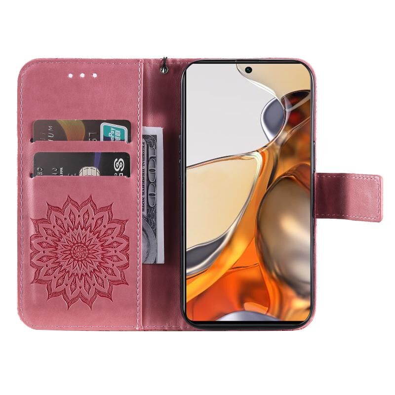 Για Xiaomi 11T / 11T Pro Πιεσμένη εκτύπωση ηλιοτρόπιο μοτίβο οριζόντια Flip PU δέρμα υπόθεση με κάτοχο & υποδοχές καρτών & πορτοφόλι & Lanyard (ροζ)