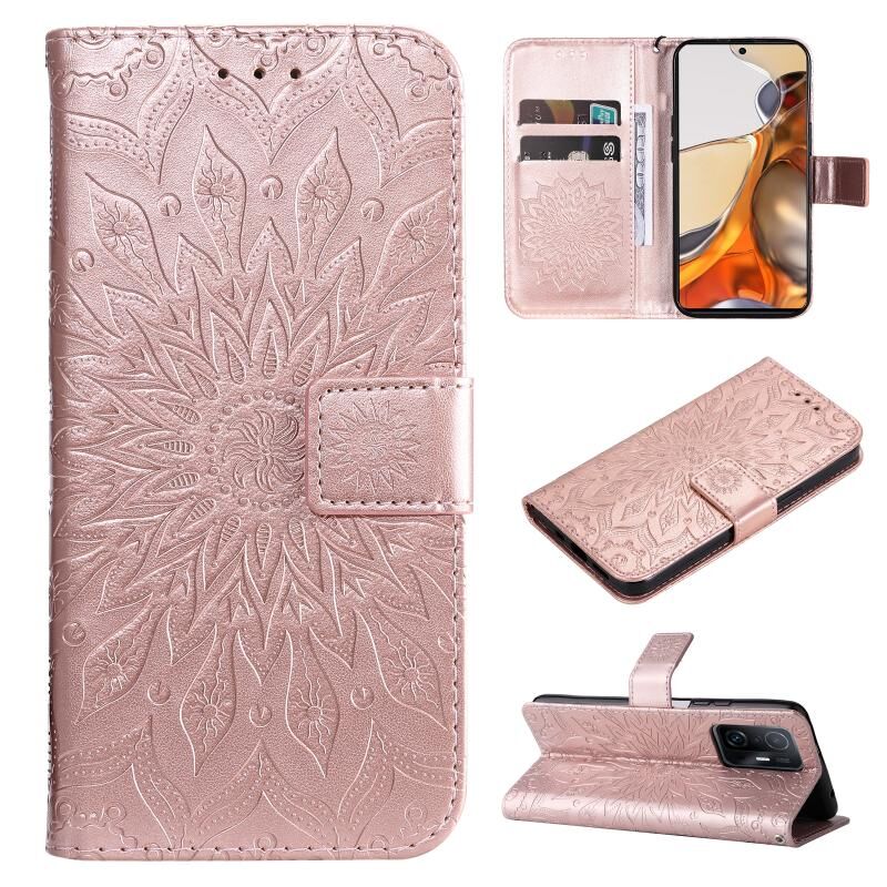 Για Xiaomi 11T / 11T Pro Πιεσμένη εκτύπωση ηλιοτρόπιο μοτίβο οριζόντια Flip PU δερμάτινη θήκη με κάτοχο & υποδοχές καρτών & πορτοφόλι & κορδόνι (Rose Gold)