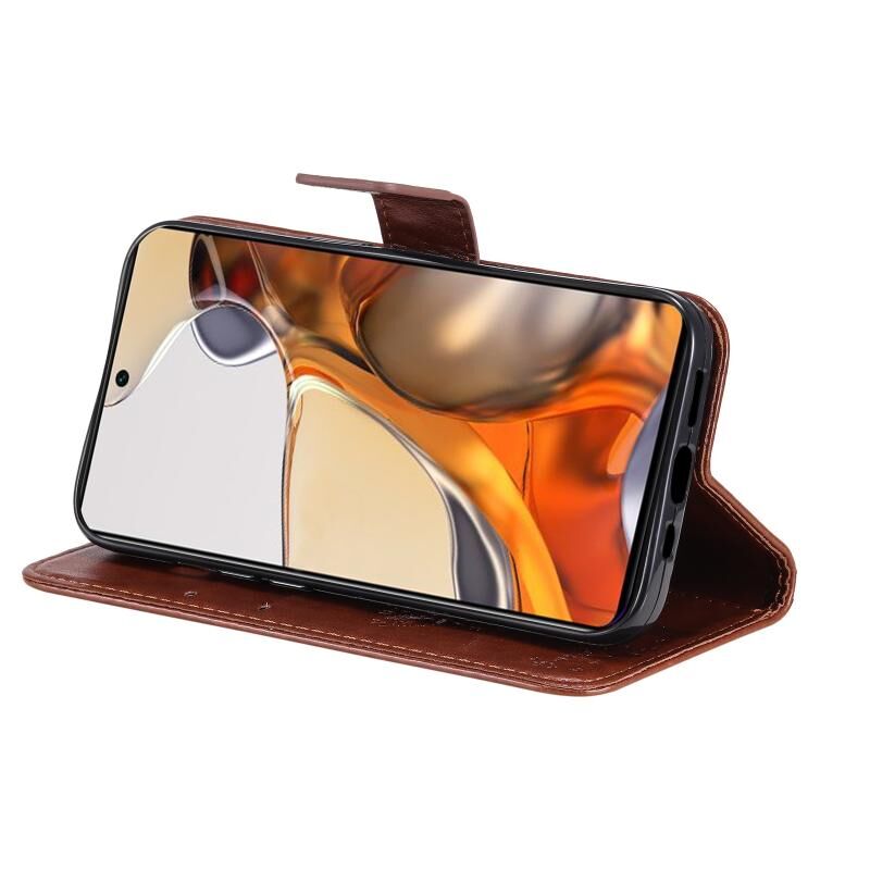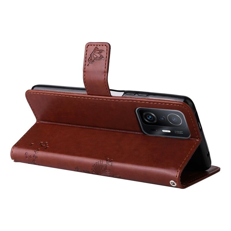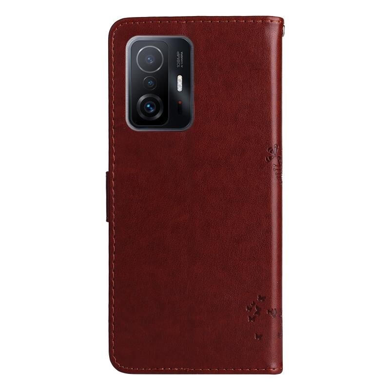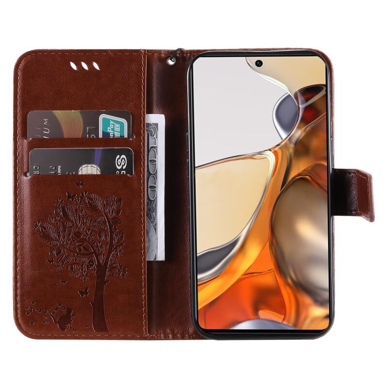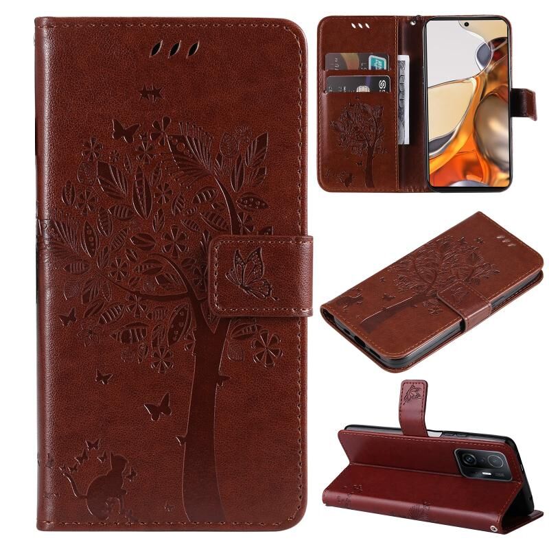 Για Xiaomi 11T / 11T Pro Tree & Cat Embossing Pattern Horizontal Flip PU Leather Case με θήκη & υποδοχές καρτών & πορτοφόλι & κορδόνι (Καφές)