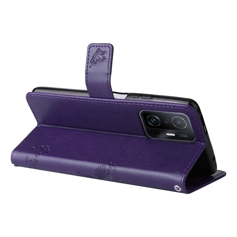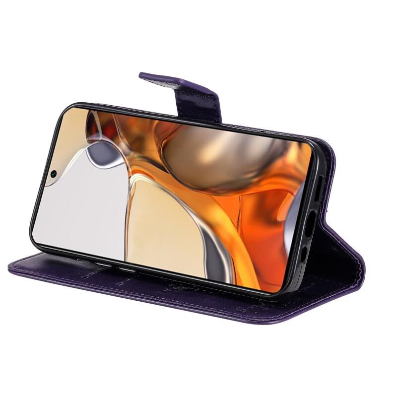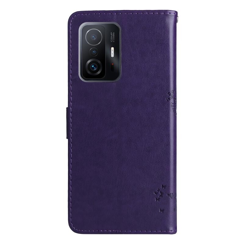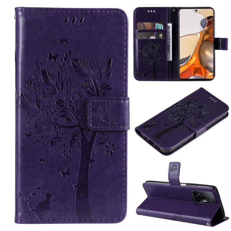 Για Xiaomi 11T / 11T Pro Tree & Cat ανάγλυφο μοτίβο οριζόντια Flip PU δέρμα υπόθεση με θήκη & υποδοχές καρτών & πορτοφόλι & Lanyard (Μωβ)