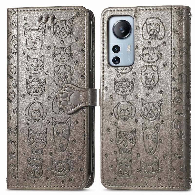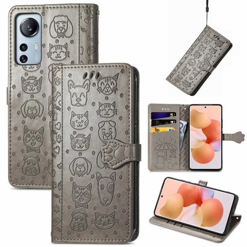 Θήκη τηλεφώνου από δέρμα με ανάγλυφα σχέδια γάτας και σκύλου για Xiaomi 12 Lite (Μωβ)