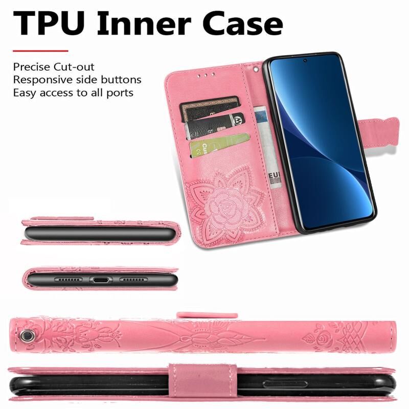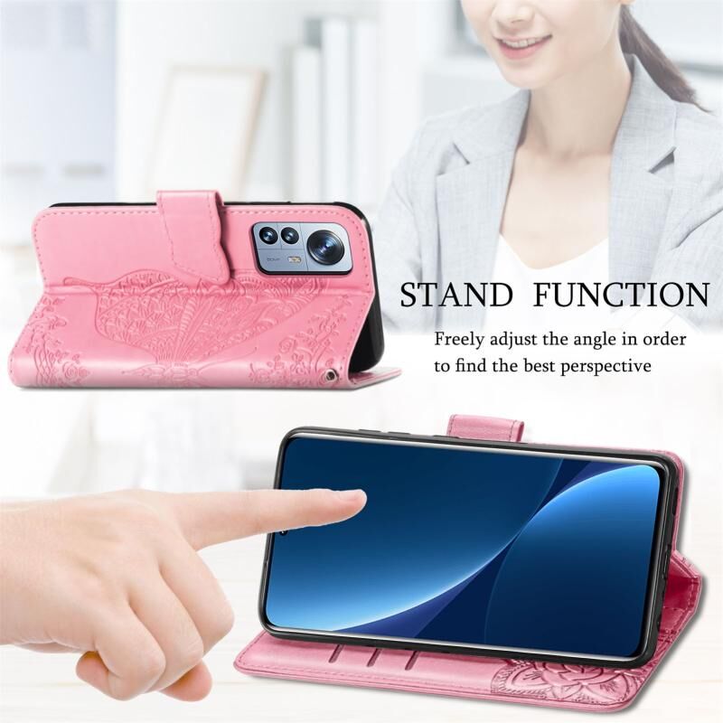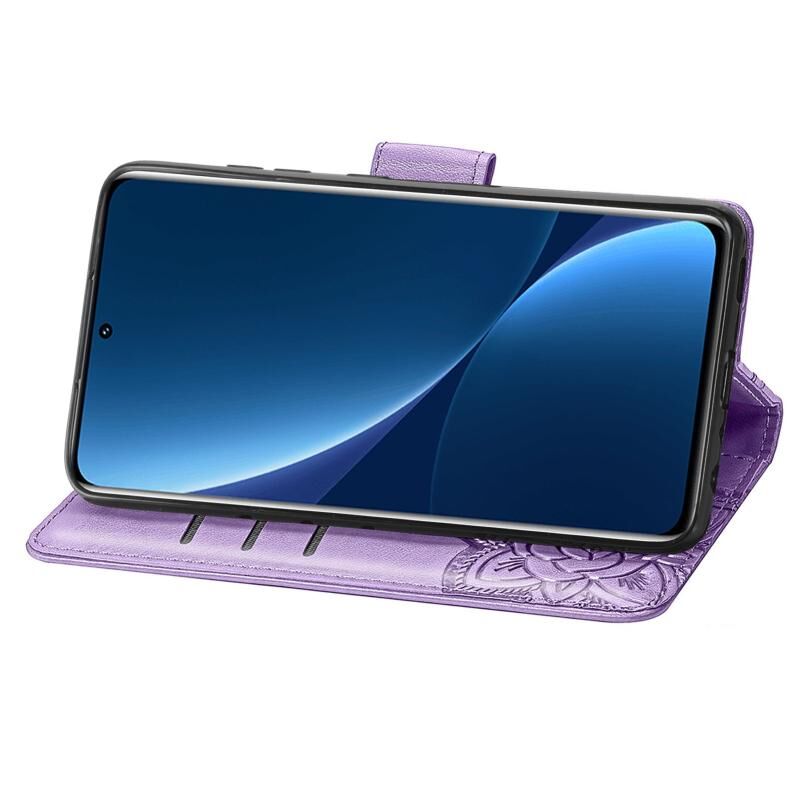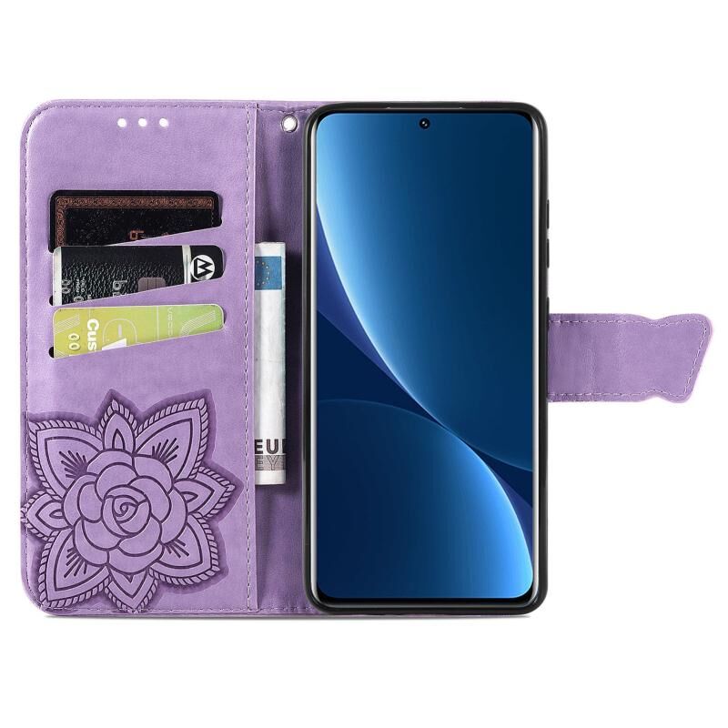 Θήκη τηλεφώνου από δέρμα με ανάγλυφο σχέδιο πεταλούδας και λουλουδιών για Xiaomi 12 Pro (ανοιχτό μωβ)