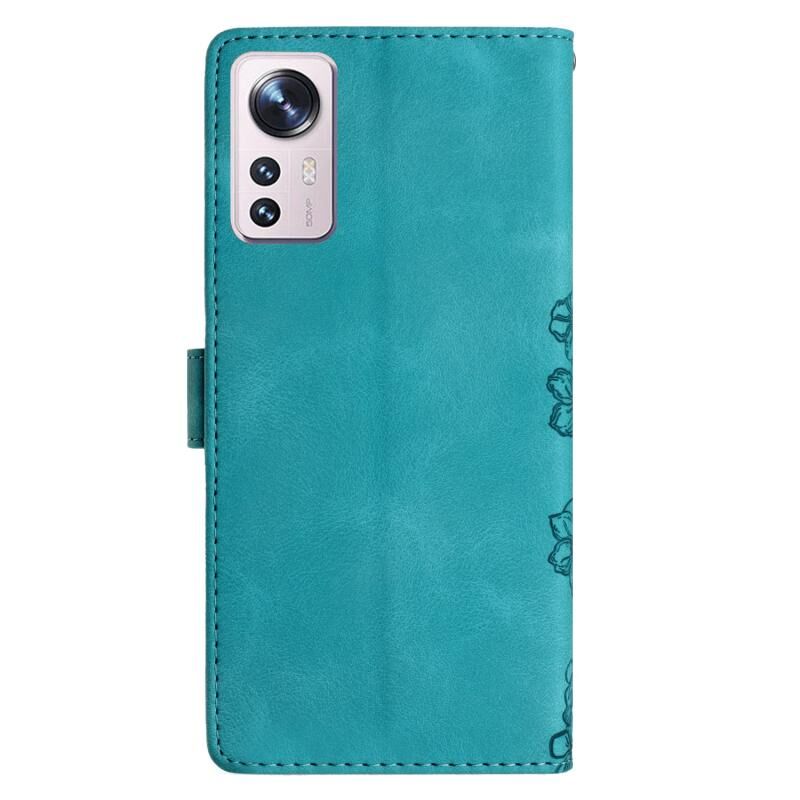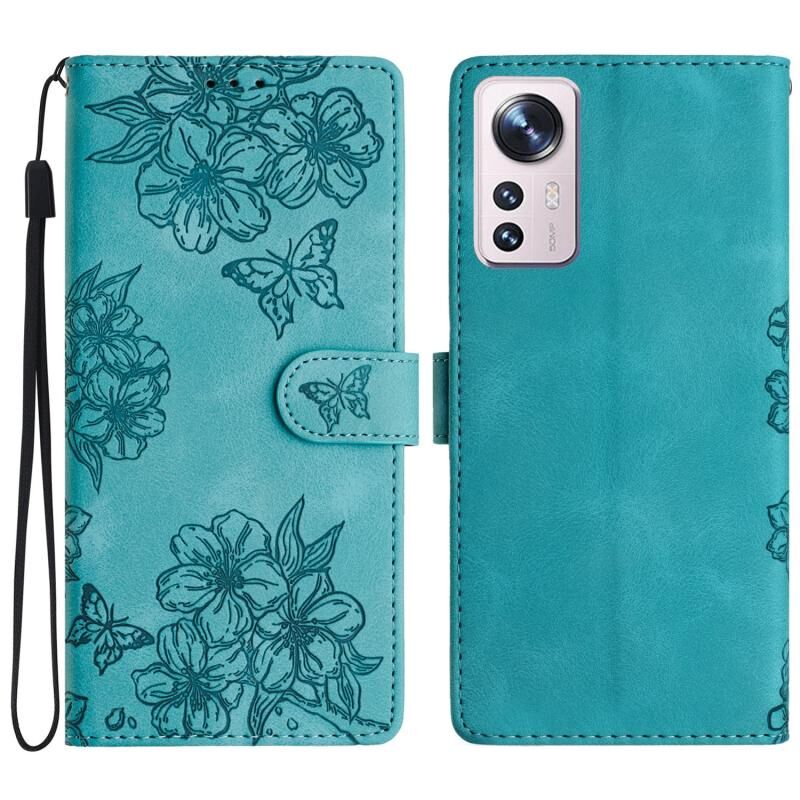 Θήκη τηλεφώνου Xiaomi 12 Pro Cherry Blossom Butterfly με ανάγλυφη υφή PU (πράσινο)