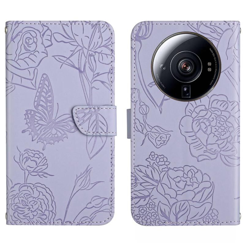 Θήκη τηλεφώνου από δέρμα με ανάγλυφο σχέδιο πεταλούδας και παιώνιας για Xiaomi 12S Ultra (Μωβ)