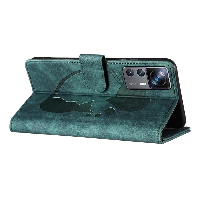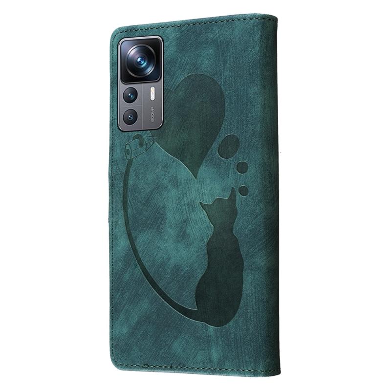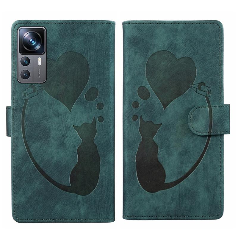 For Xiaomi 12T / 12T Pro Pen Heart Cat Embossed Leather Phone Case(Green)