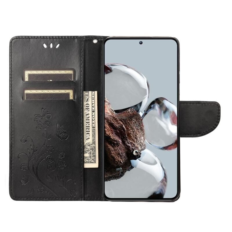 Θήκη τηλεφώνου από δέρμα με σχέδιο πεταλούδας και λουλουδιών για Xiaomi 12T / 12T Pro / Redmi K50 Ultra (Μαύρο)