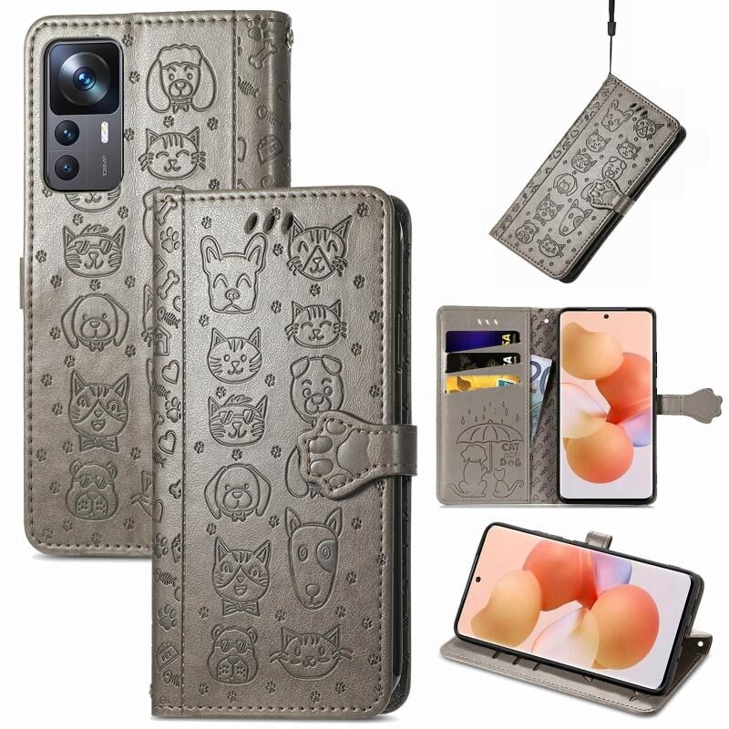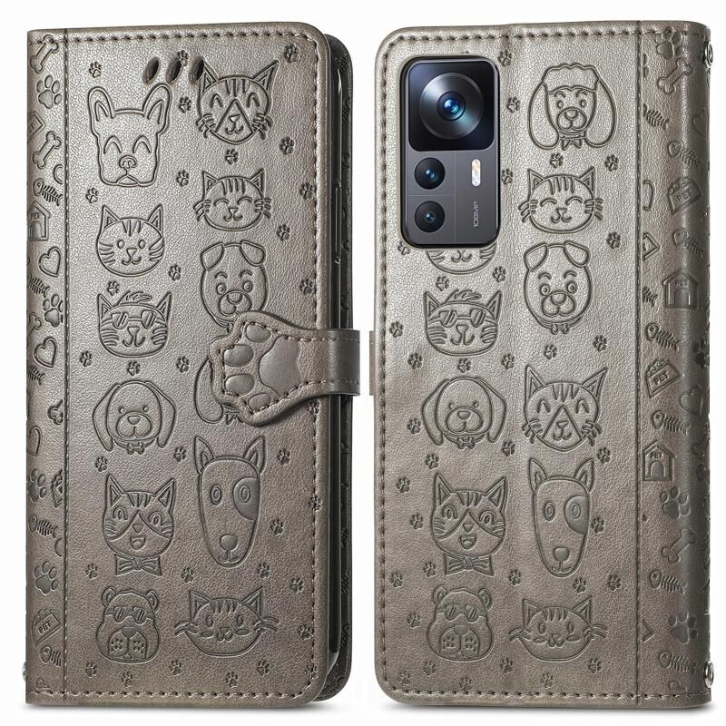 Θήκη τηλεφώνου από δέρμα με ανάγλυφα σχέδια χαριτωμένων γάτας και σκύλου για Xiaomi 12T / 12T Pro / Redmi K50 Ultra (Γκρι)