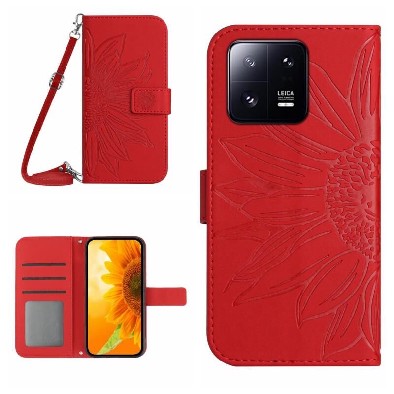Για Xiaomi 13 HT04 Skin Feel Sun Flower ανάγλυφο ανάγλυφο Flip δερμάτινη θήκη τηλεφώνου με κορδόνι (Κόκκινο)