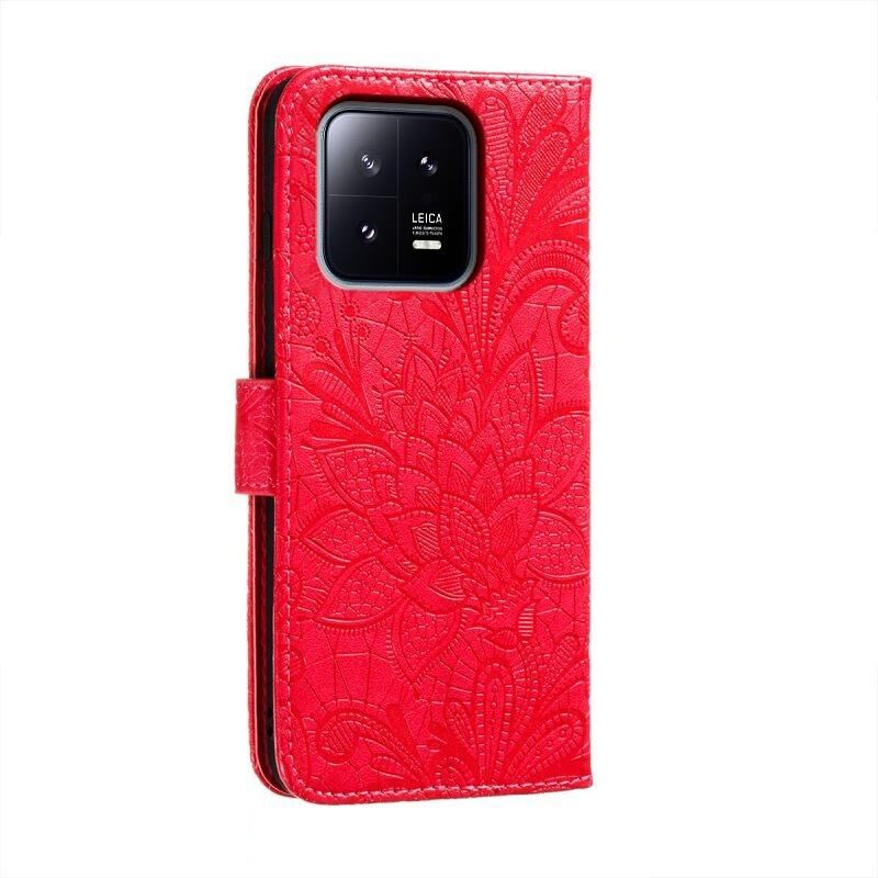 Για Xiaomi 13 δαντέλα λουλούδι ανάγλυφο Flip υπόθεση τηλεφώνου δέρμα (κόκκινο)