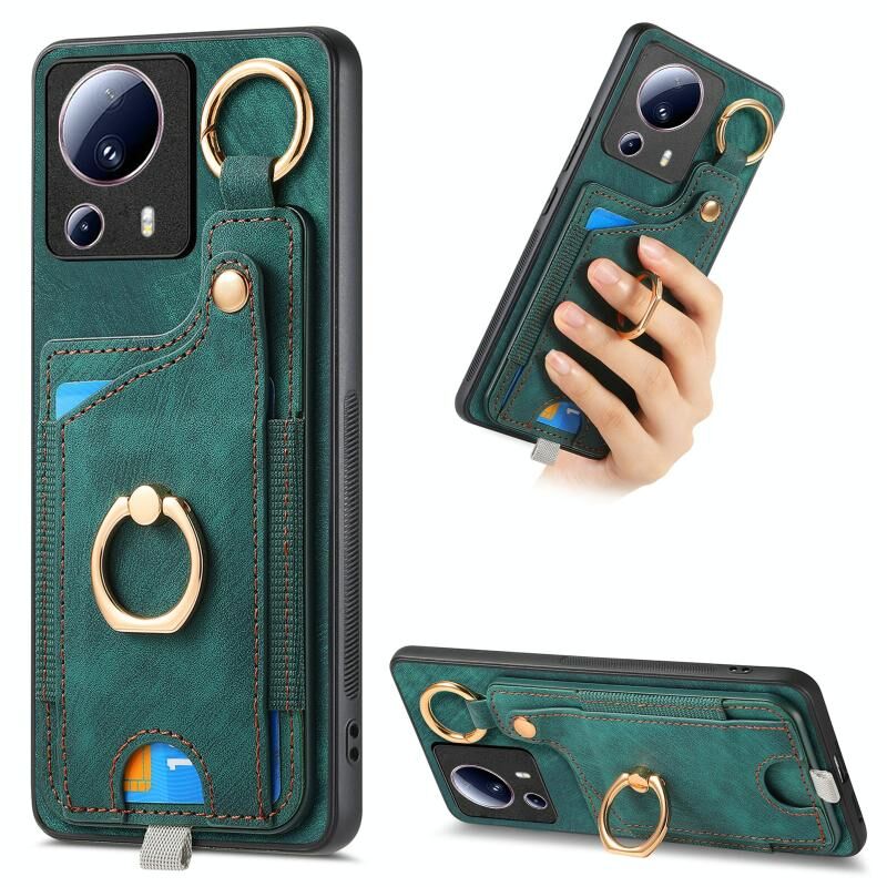 Για Xiaomi 13 Lite Ρετρό δέρμα αίσθηση δαχτυλίδι κάρτα τσάντα υπόθεση τηλεφώνου με Hang Loop (πράσινο)