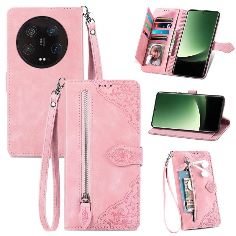 Για Xiaomi 13 Ultra ανάγλυφο λουλούδι φερμουάρ δερμάτινη θήκη τηλεφώνου (ροζ)