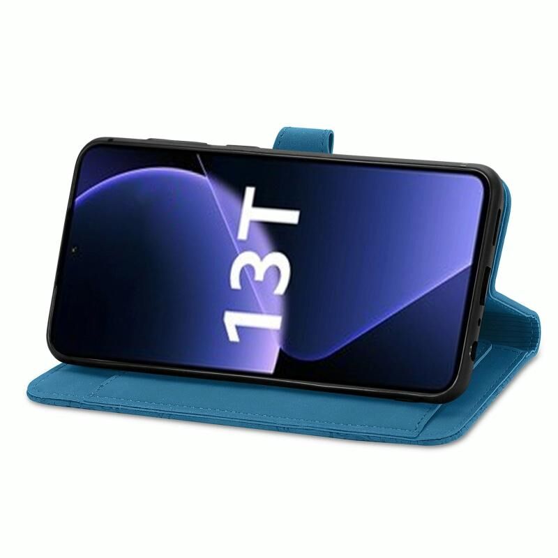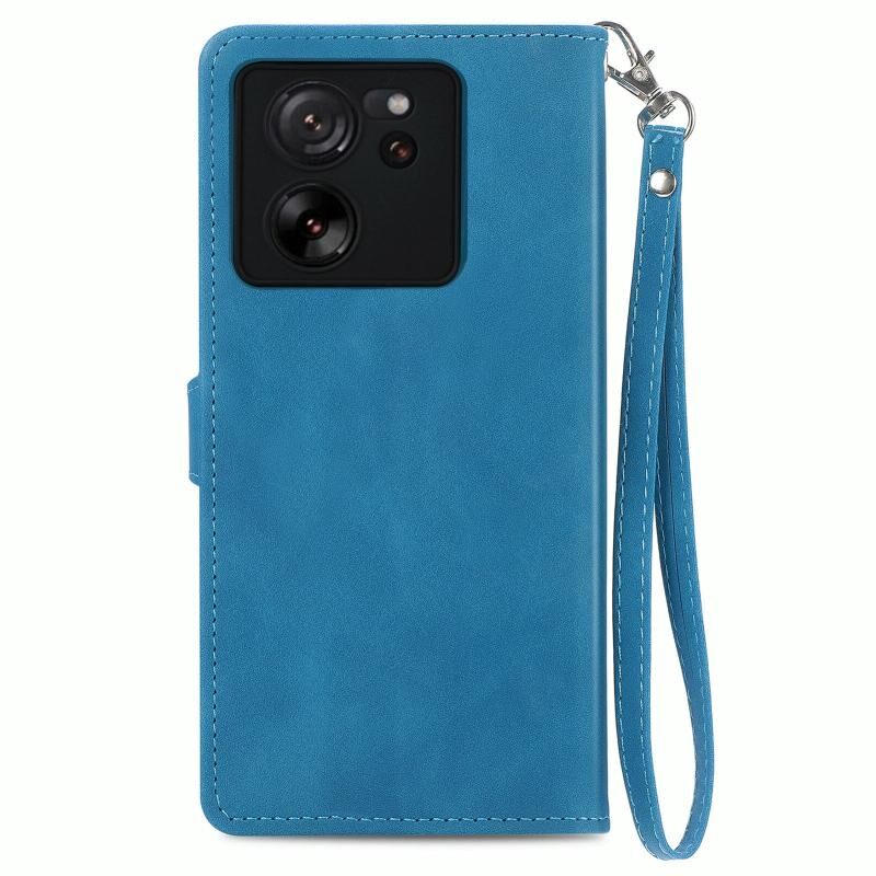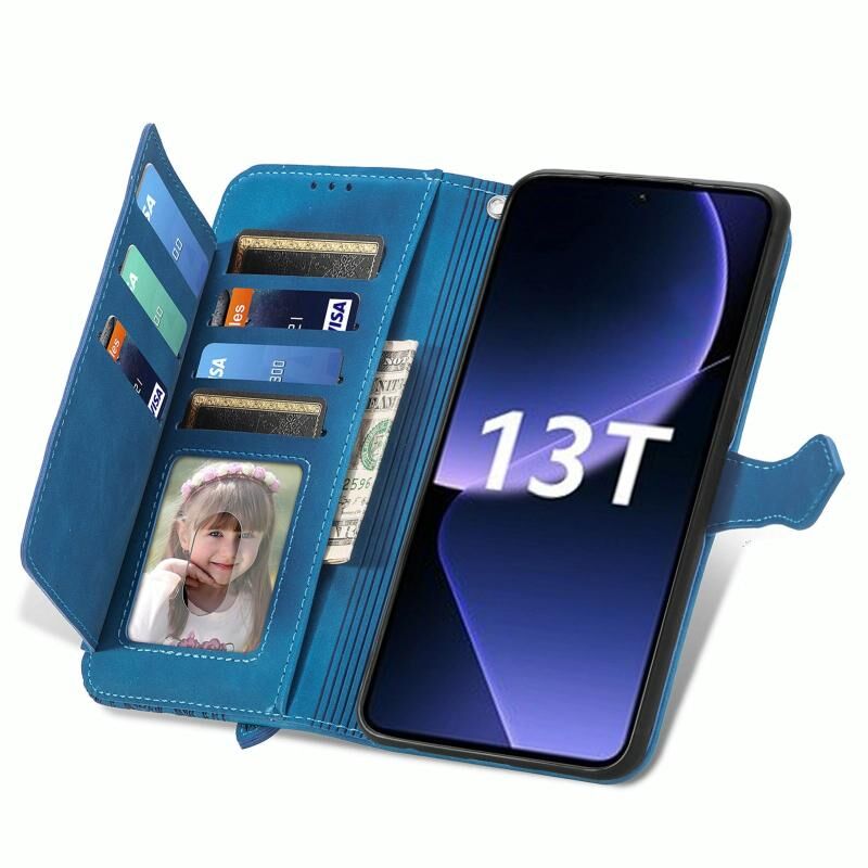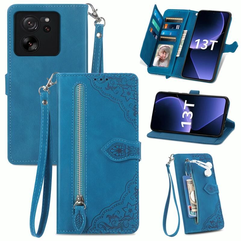 Για Xiaomi 13T / 13T Pro ανάγλυφο λουλούδι φερμουάρ δερμάτινη θήκη τηλεφώνου (μπλε)