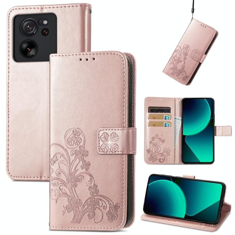 Για Xiaomi 13T / 13T Pro τετράφυλλο κούμπωμα ανάγλυφη δερμάτινη θήκη τηλεφώνου (Ροζ χρυσός)