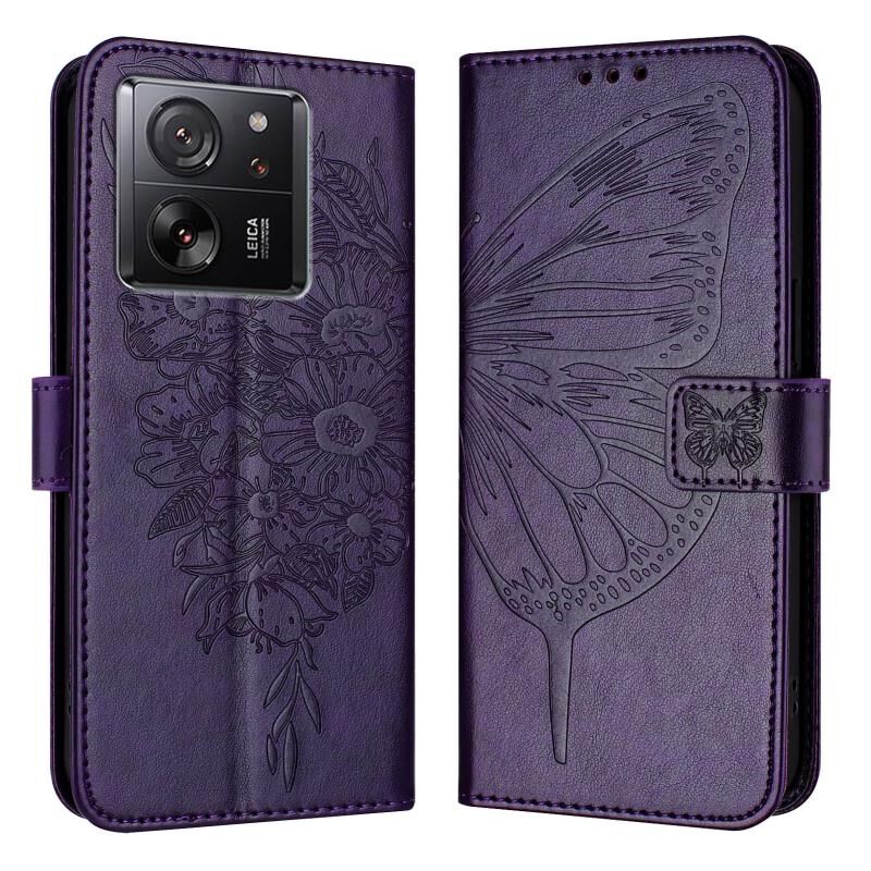 Για Xiaomi 13T / 13T Pro Παγκόσμια ανάγλυφη πεταλούδα δερμάτινη θήκη τηλεφώνου (σκούρο μωβ)