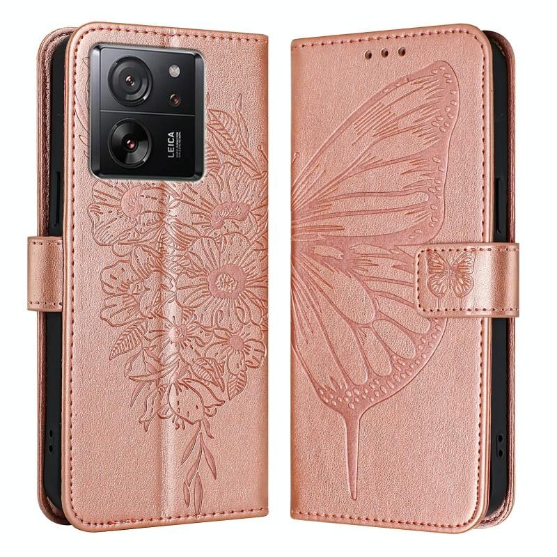 Για Xiaomi 13T / 13T Pro Παγκόσμια ανάγλυφη πεταλούδα δερμάτινη θήκη τηλεφώνου (Rose Gold)