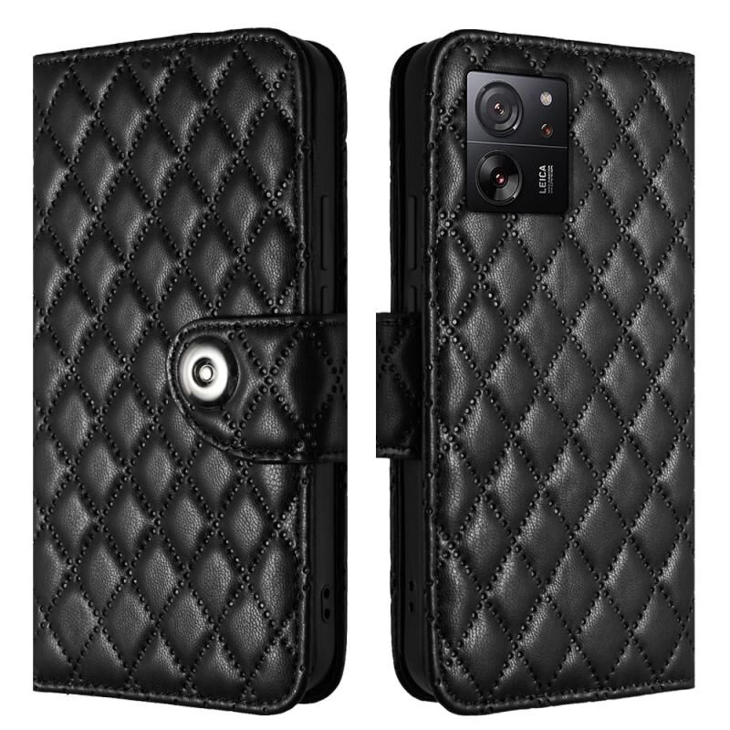 Για Xiaomi 13T / 13T Pro Rhombic Texture Flip δέρμα τηλέφωνο υπόθεση με κορδόνι (μαύρο)
