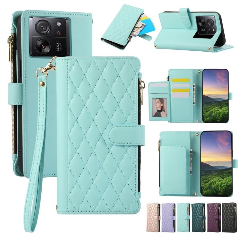 Για Xiaomi 13T / 13T Pro Rhombic φερμουάρ πορτοφόλι δερμάτινη θήκη τηλεφώνου (Cyan)