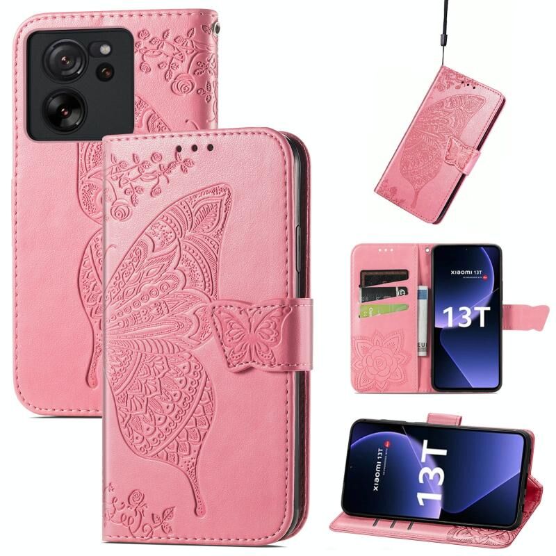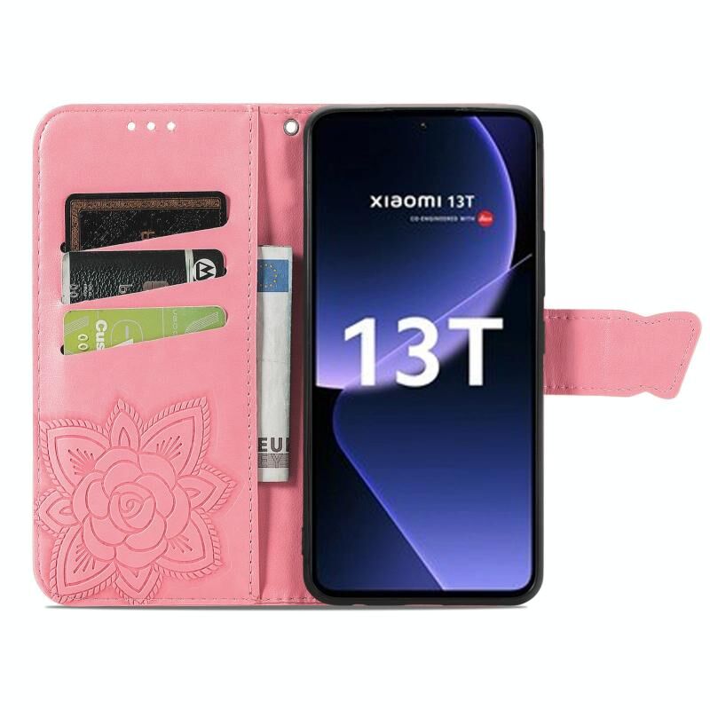 Θήκη τηλεφώνου δερμάτινη ανάγλυφη με σχέδιο πεταλούδας και λουλουδιών για Xiaomi 13T (Χρυσορόζ)