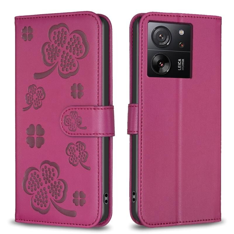 Για Xiaomi 13T Τέσσερα φύλλα ανάγλυφη δερμάτινη θήκη τηλεφώνου (Ροζέ κόκκινο)