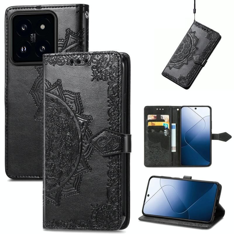 Για Xiaomi 14 Mandala λουλούδι ανάγλυφο δερμάτινη θήκη τηλεφώνου (μαύρο)