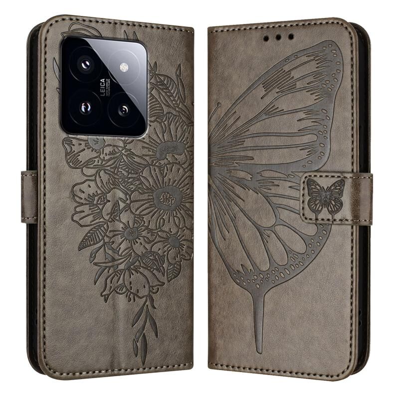 Για Xiaomi 14 Pro 5G Παγκόσμια ανάγλυφη πεταλούδα δερμάτινη θήκη τηλεφώνου (γκρι)