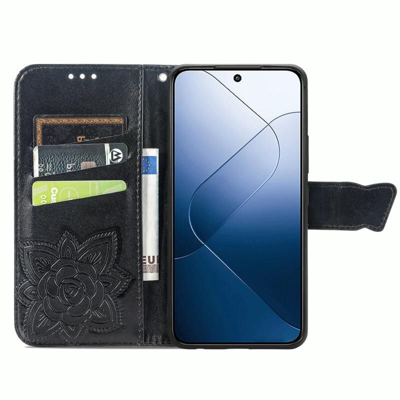 Θήκη τηλεφώνου από δέρμα με ανάγλυφο σχέδιο πεταλούδας και λουλουδιών για Xiaomi 14 Pro (Χρυσορόζ)