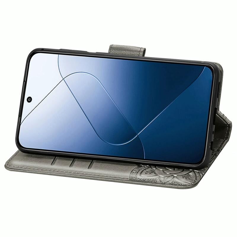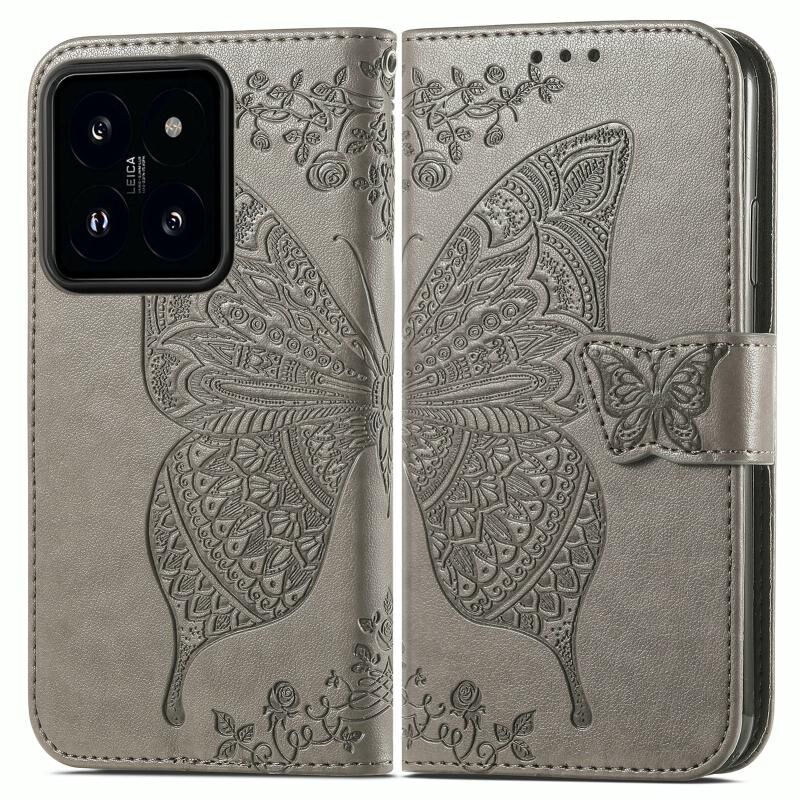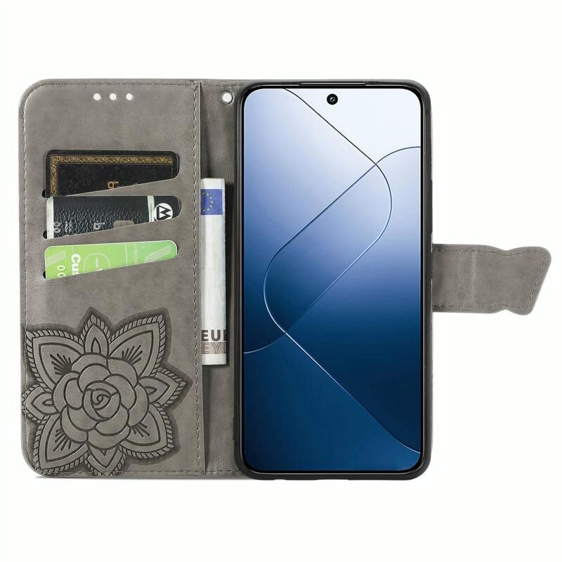 Θήκη τηλεφώνου από δέρμα με ανάγλυφο σχέδιο πεταλούδας και λουλουδιών για Xiaomi 14 Pro (Χρυσορόζ)