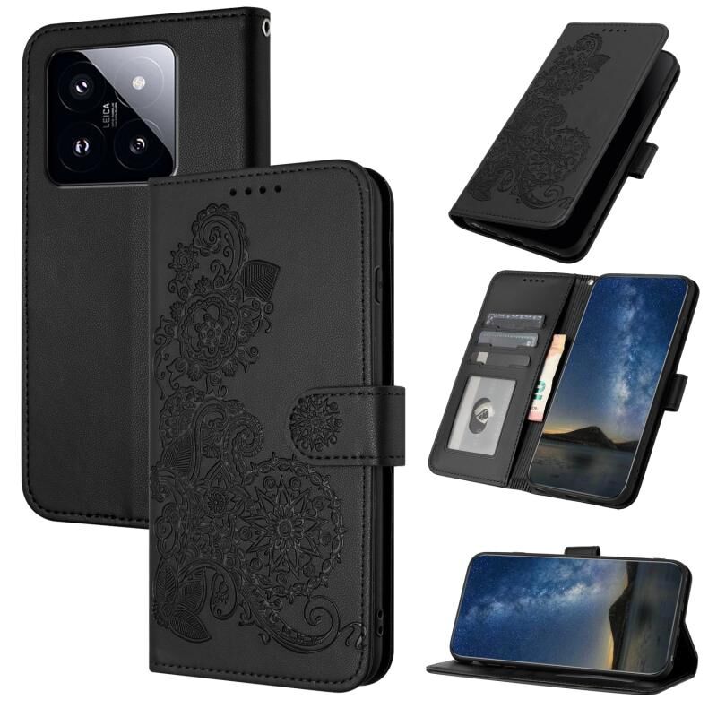Για Xiaomi 14 Pro Datura λουλούδι ανάγλυφο Flip υπόθεση τηλεφώνου δέρμα (μαύρο)