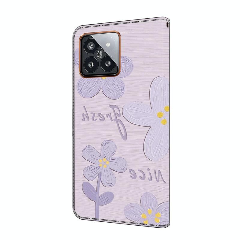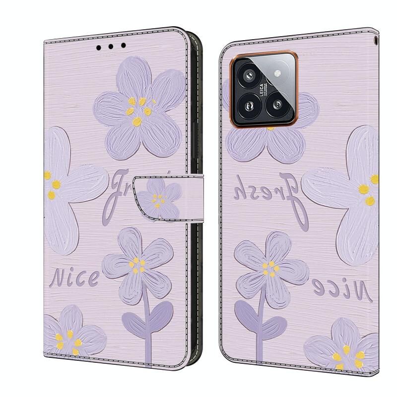 Θήκη τηλεφώνου Xiaomi 14 Pro από φρέσκο ​​βαμμένο δέρμα (Μωβ λουλούδια ζωγραφικής με λάδι)
