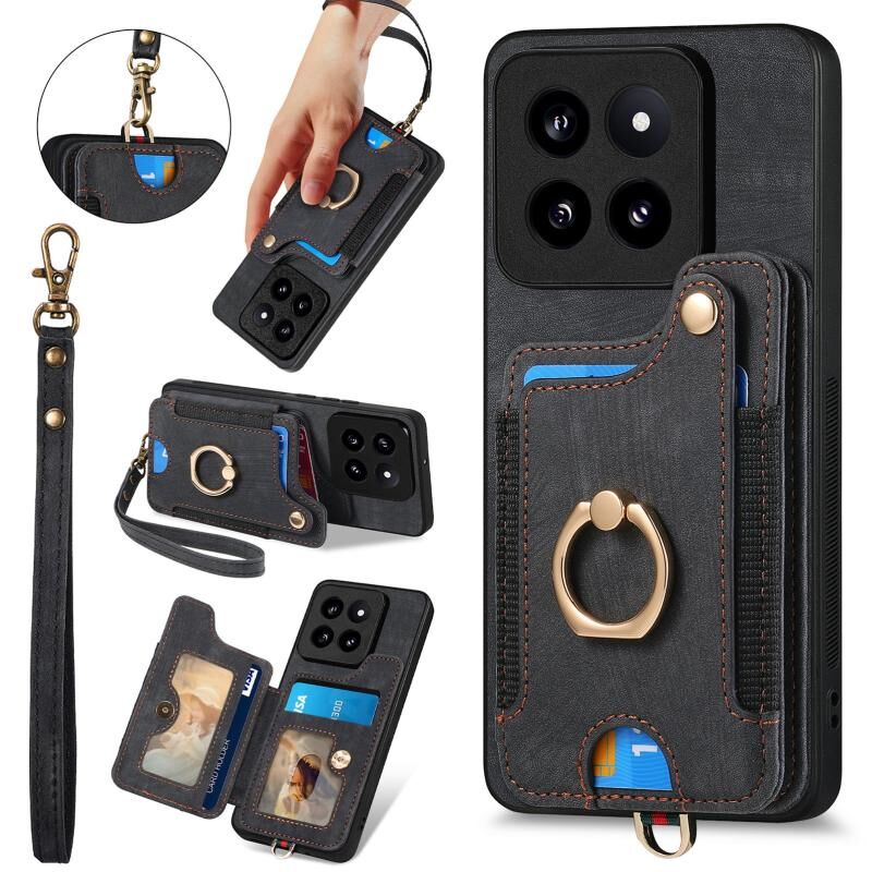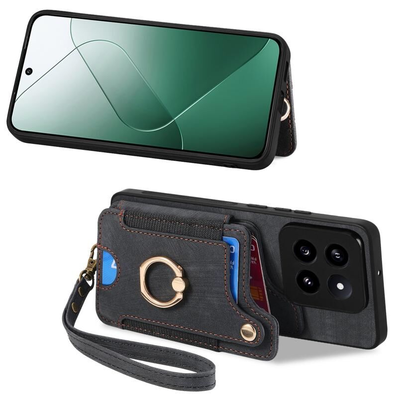 Για Xiaomi 14 Pro Ρετρό δέρμα αίσθηση δαχτυλίδι πολυ-κάρτα RFID πορτοφόλι υπόθεση τηλεφώνου (Μαύρο)