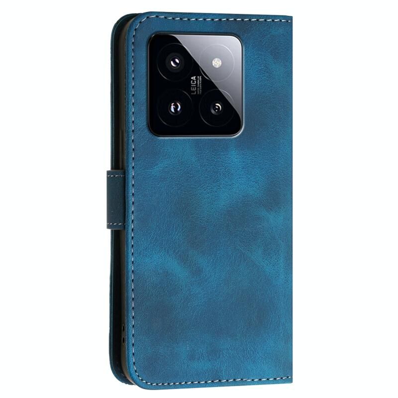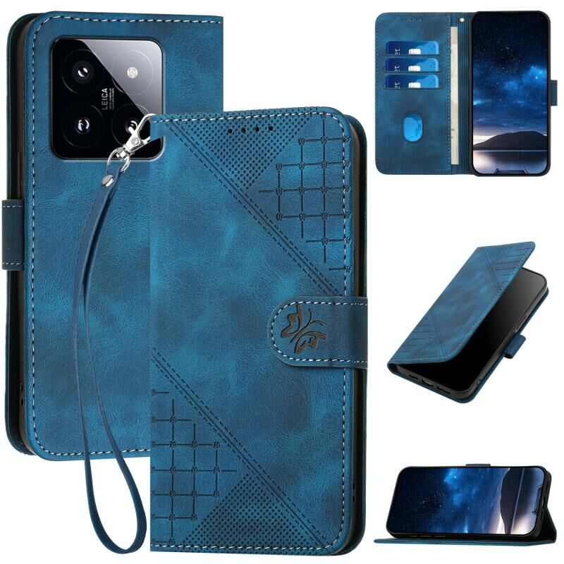 For Xiaomi 14 Pro YX0080 Grid Butterfly Embossed Pattern Leather Phone Case with Lanyard(Dark Blue)