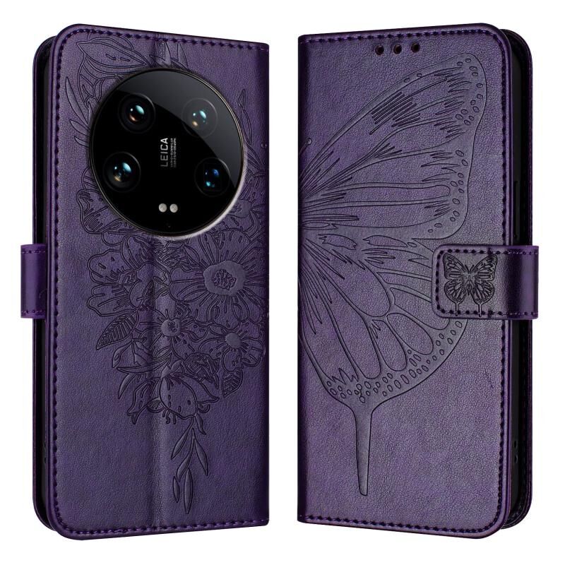 Για Xiaomi 14 Ultra 5G Παγκόσμια ανάγλυφη πεταλούδα δερμάτινη θήκη τηλεφώνου (σκούρο μωβ)