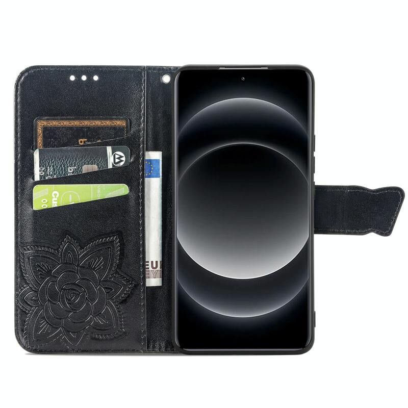 Θήκη τηλεφώνου από δέρμα με ανάγλυφο σχέδιο πεταλούδας και λουλουδιών για Xiaomi 14 Ultra (Μαύρο)