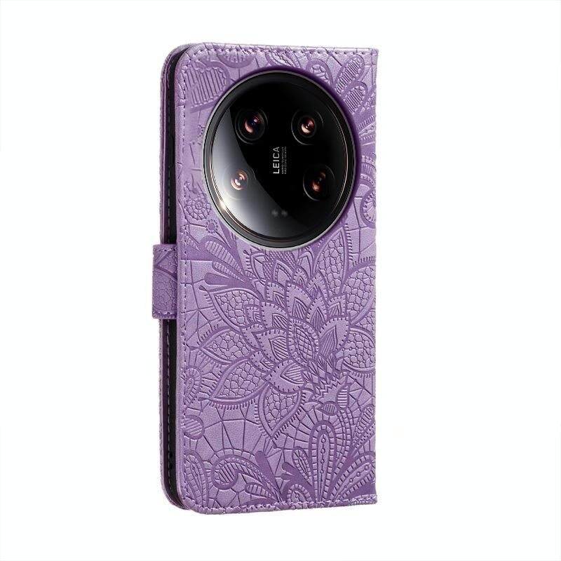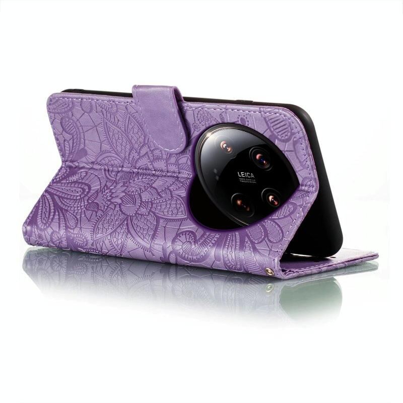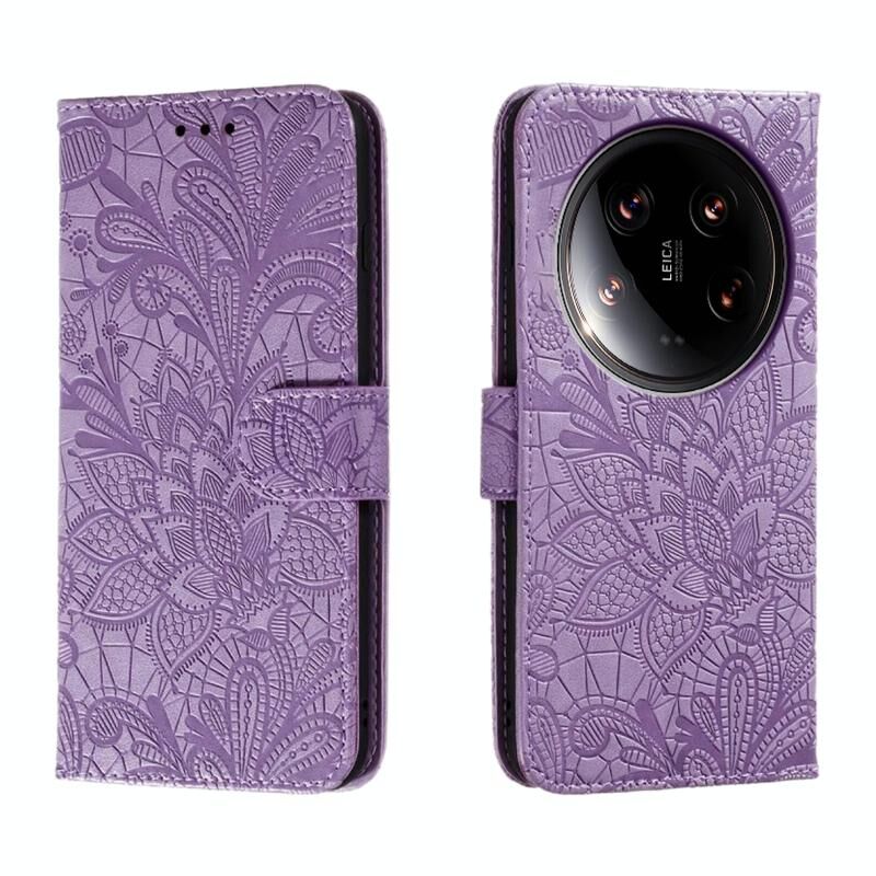 Για Xiaomi 14 Ultra Lace λουλούδι ανάγλυφο Flip δερμάτινη θήκη τηλεφώνου (μωβ)