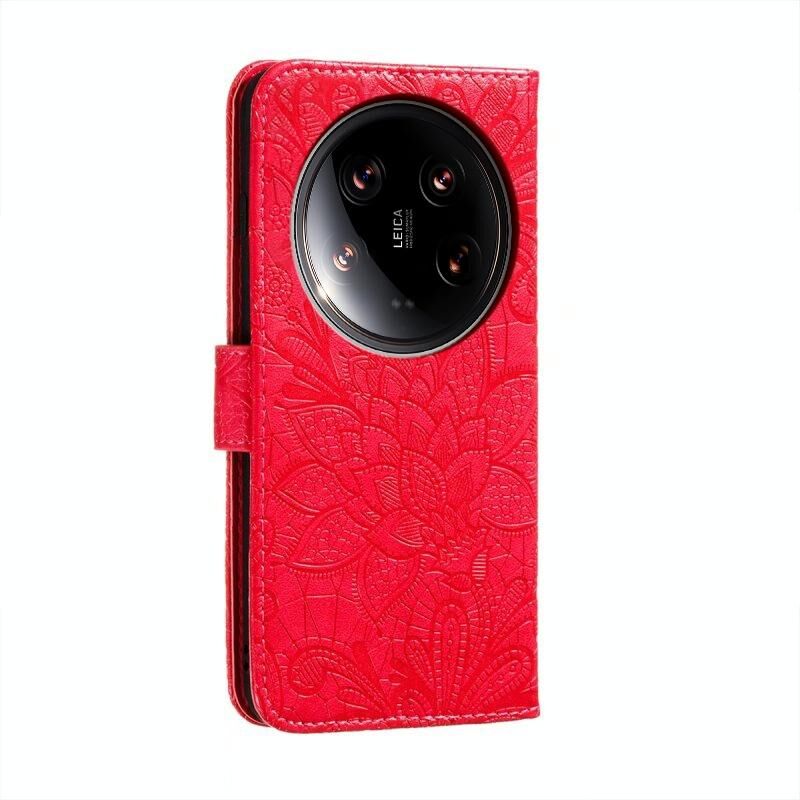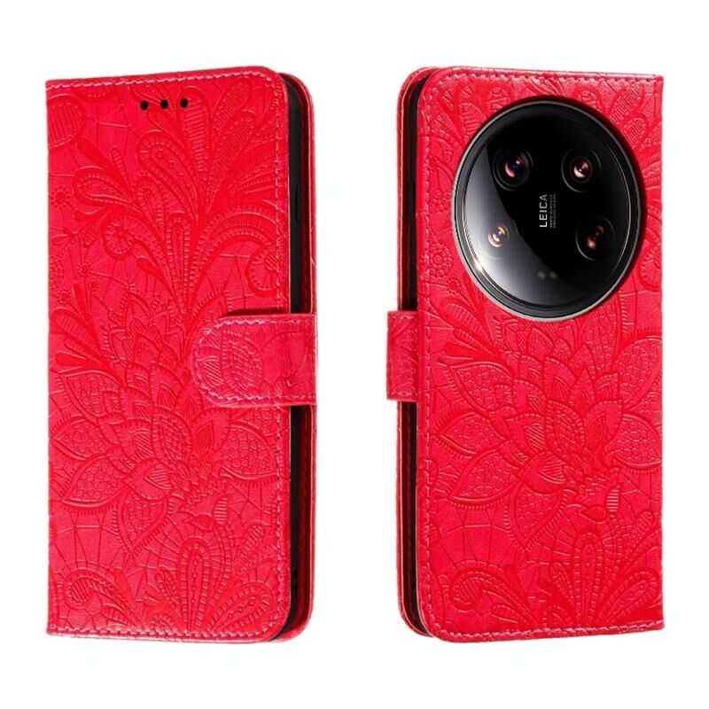 Για Xiaomi 14 Ultra Lace λουλούδι ανάγλυφο Flip δέρμα τηλέφωνο υπόθεση (κόκκινο)